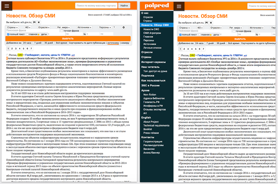 Чем меньше устройство, тем более облегченная версия показывается пользователю. Так, на всех смартфонах, а также на планшетах при вертикальном просмотре, меню для экономии места на экране превращается в «иконку» в верхней левой части экрана, по нажатии на которую меню слева выдвигается или убирается обратно (см. скриншоты). На смартфонах при вертикальном просмотре доступны только базовые выпадающие меню (Отрасли, Федокруга РФ, Страны, Регионы, Источники); переверните устройство в горизонтальный режим и к ним добавятся «Подотрасли», «Субъекты РФ», «Персоны», то есть меню станет максимально приближенным к настольной версии. Панель с кнопками «Отметить все», «Добавить в Избранное», «Избранное», «Личные списки» не видна при горизонтальном просмотре на планшете, но если его перевернуть, эти функции будут доступны. Просмотр сайта на планшете в горизонтальном формате при ширине не менее 1024 пикселей полностью идентичен по функциям настольной версии polpred.com.